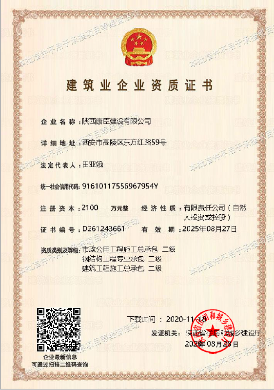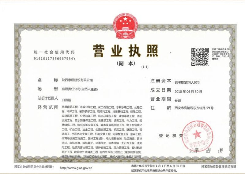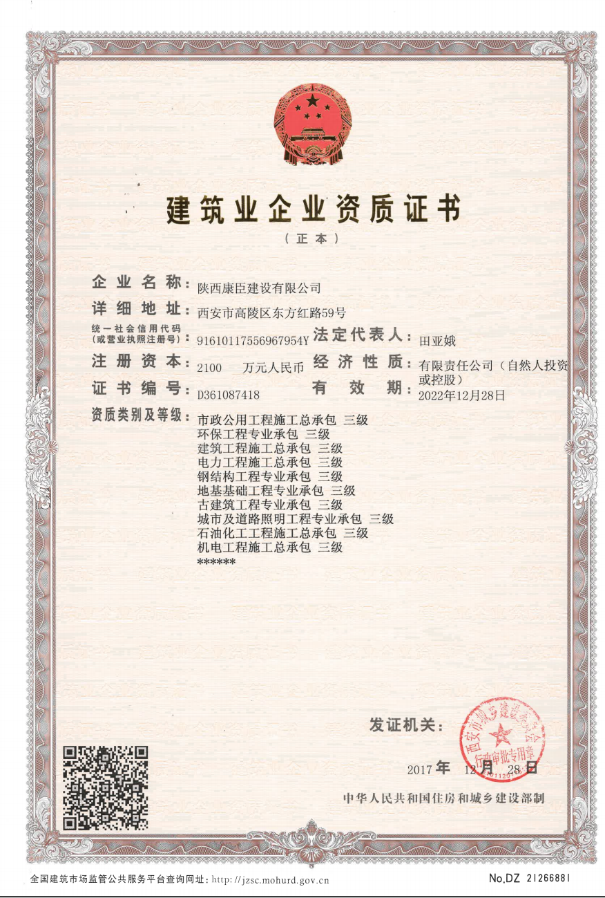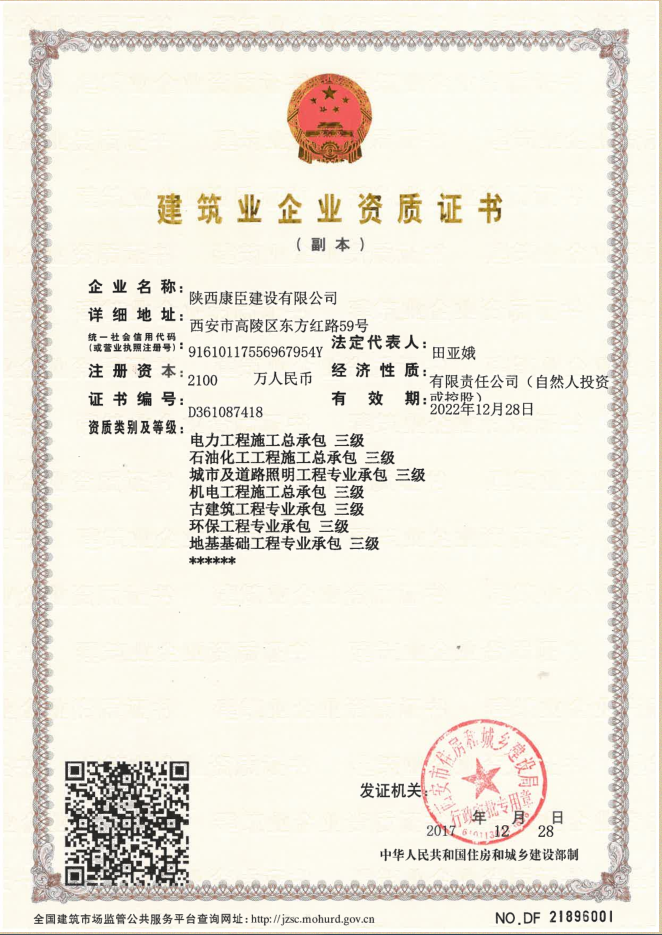 陜西康臣建設(shè)有限公司(簡稱康臣建設(shè))始建于2010年6月,注冊資金2100萬元整。公司是從事市政公用工程、房屋建筑工程、城市及道路照明工程、電力工程、石油化工工程為主的企業(yè),具有建筑工程施工總承包二級、市政公用工程施工總承包二級、鋼結(jié)構(gòu)工程施工專業(yè)承包二級、城市及道路照明工程專業(yè)承包、電力工程施工總承包、石油化工工程施工總承包、環(huán)保工程專業(yè)承包、機電工程施工總承包、地基基礎(chǔ)工程專業(yè)...more+